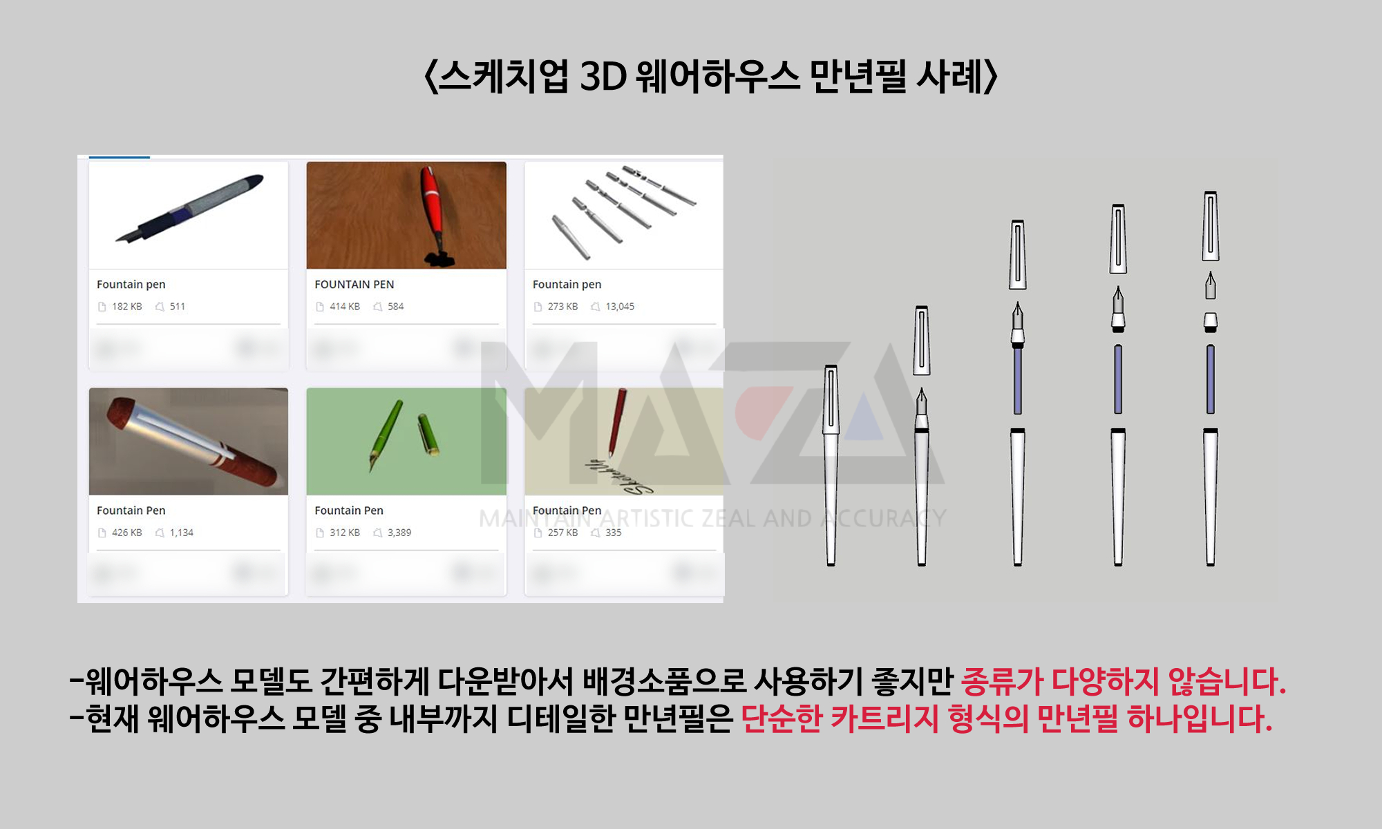 이런 우아한 매력이 있는 만년필이지만 아쉽게도 웹툰배경소스에서는 쉽게 찾아볼 수가 없습니다. 앞에서도 언급했다시피 웹툰배경소스를 판매하는 유명한 플랫폼에서도 만년필을 검색하면 겨우 한 페이지를 채울까할 정도로 결과가 나오며, 스케치업 소스를 무료로 다운받아 이용할 수 있는 '3D 웨어하우스' 플랫폼 조차 만년필의 종류와 양이 매우 한정적입니다. 만약 웹툰에서 현실을 반영한 디테일을 살려 소설가가 글을 쓰는 장면이나 각국 정상들이 회담에서 서명을 하는 장면, 대기업 CEO가 사인을 하는 장면을 연출하고 싶은데 단순히 볼펜이나 연필같은 도구를 사용한다면 분명 약간의 아쉬움이 있을거라 생각됩니다. 물론 앞에서 언급한 장면들이 찰나에 불과하여 볼펜이나 연필로 연출하실 수도 있겠지만 만년필을 잘 알고, 만년필을 한 번이라도 써본 작가분들이라면 분명 약간의 아쉬움이 남을 것입니다.(막상 또 만년필을 그리려고 하면 시간도 잡아먹고 귀찮기도 하고요.)