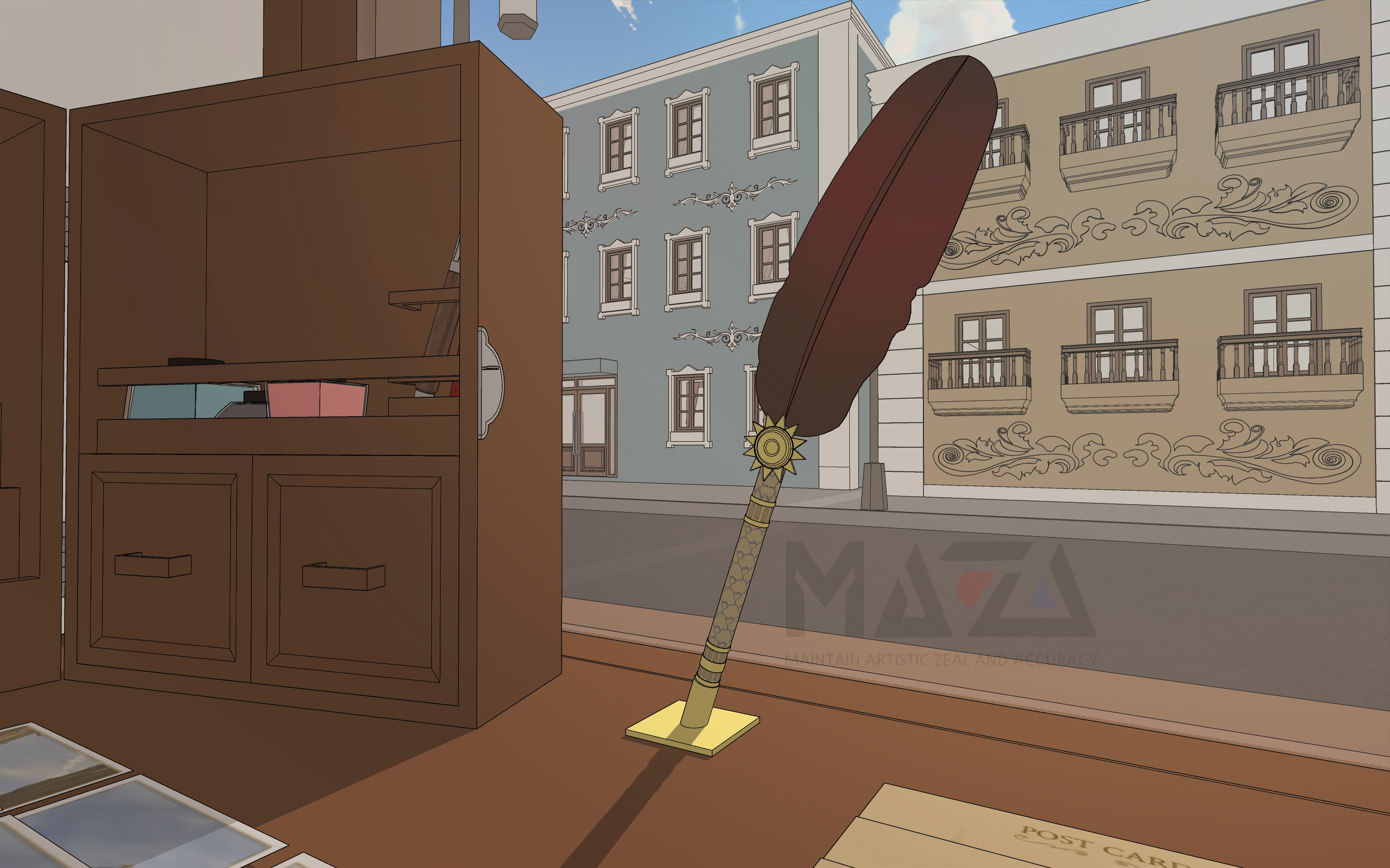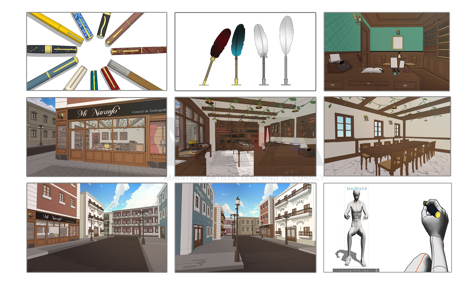 만년필 컬렉션 웹툰 배경은 소설가의 삶에서 영감을 받아 제작을 하였습니다. 소설가가 자주 다니거나 직접 운영하는 만년필 가게부터 글을 쓰기 위해 자주 가는 공원과 캠핑장, 그리고 서재를 함께 만들었습니다. 추가로 만년필을 즐겨쓰는 어느 CEO의 서재도 같이 만들었지요. 웹툰 배경의 전체적인 양식은 로맨스 판타지에 어울릴 수 있도록 제작을 하였으며 현대물과도 잘 어울릴 수 있도록 웹툰 배경을 제작하였습니다.