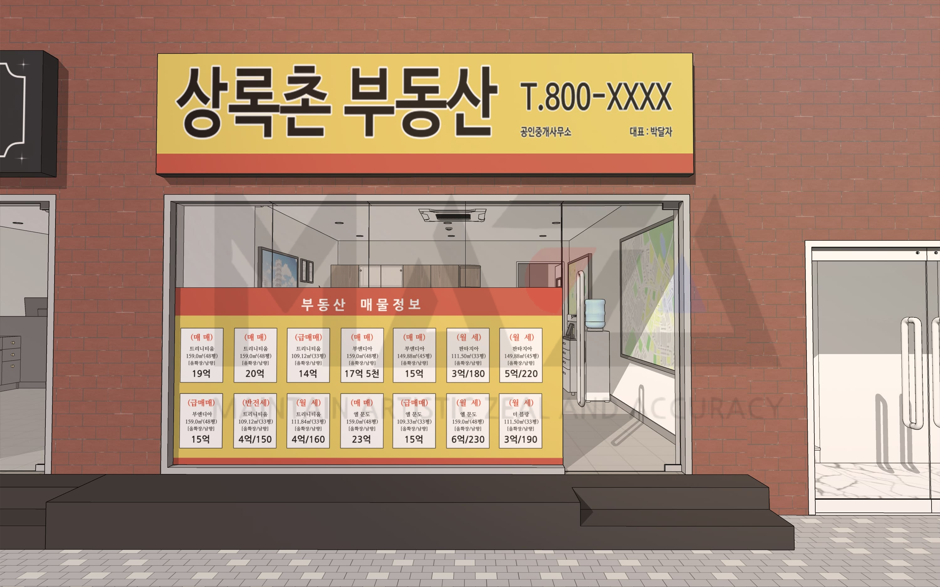 웹툰 배경 디자이너 마자(MAZA)입니다. 이번에 소개할 웹툰 배경은 '타투(문신) 피어싱 가게와 부동산'입니다. 원래는 단독으로 타투와 피어싱 가게만 제작하려고 하였으나 개인적인 욕심에 부동산까지 포함하여 만화 배경을 제작하였습니다. 비록 단편선 만화에 나오는 찰나의 장면이라 할지라도 내부뿐만 아니라 외부까지 좀 더 잘 구성해 놓는다면 웹툰 작가분들께서 작업하실 때 좀 더 유용하게 활용하시지 않을까 하는 생각에 배경 리소스를 더 제작하게 되었습니다.