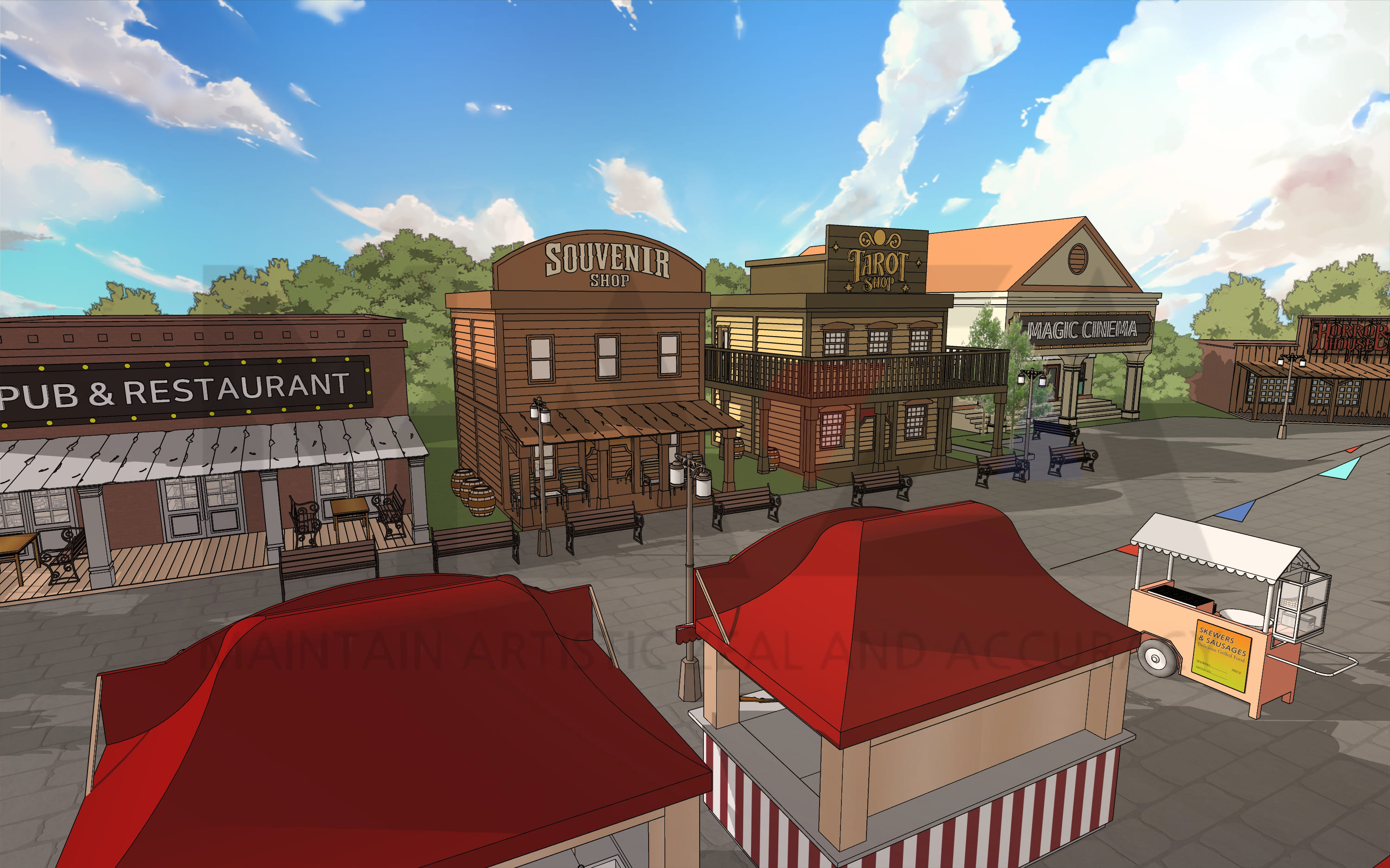 이번에 제작한 '미국 서부 시골의 작은 서커스 놀이공원' 배경은 미국 서부지역 어느 시골에 있는 작은 놀이공원을 상상하며 제작한 스케치업 배경입니다. 서커스장을 중심으로 지역주민들이 즐길 수 있는 펍과 소형 극장, 노점, 대관람차 등을 넣어봤는데요. 여기에 더해 기묘한 느낌을 연출할 수 있는 타로 가게도 같이 배치하였습니다. 왠지 시골구석에 있는 작은 놀이공원에 미래를 내다보는 점성술사 하나쯤은 있을 것 같은 상상이 들었기 때문이지요. 이번 배경은 미국을 배경으로 삼아 웹툰을 연출하는 국내외 작가님들 외에도 웹툰에서 독특한 컨셉의 놀이공원에서 데이트 장면을 연출하고 싶은 작가님들께도 도움이 될 웹툰 배경이 될 것이라 생각됩니다. 또한 타로 가게도 같이 배치를 해놨기에 회귀물이나 기묘한 느낌의 장면을 연출하실 수도 있으시고요. 작가님들께서 다양한 장면을 연출하실 수 있도록 서커스 공연장과 소규모 극장, 펍 내부를 모두 꾸몄기에 이번 웹툰 배경 역시 유용하게 사용하실 수 있으실 거라 생각됩니다.