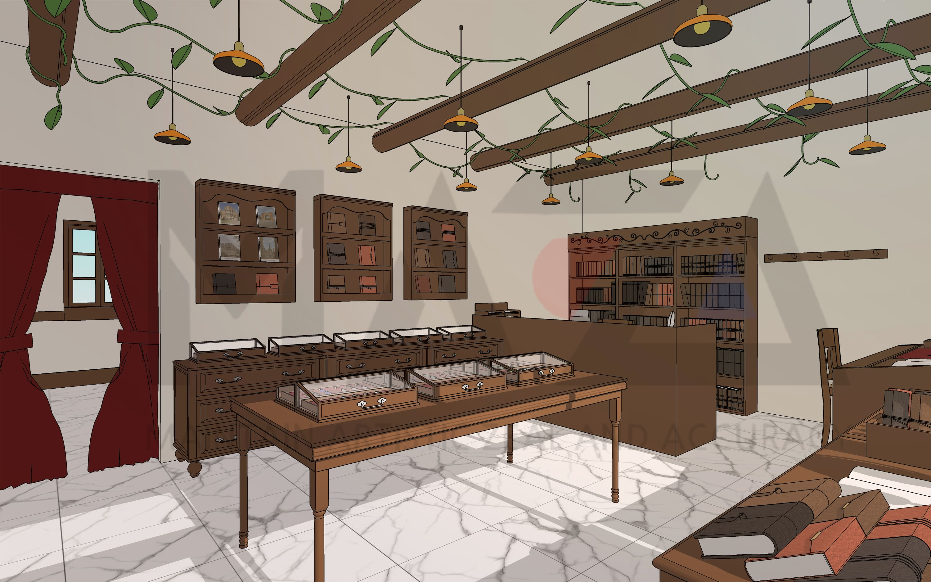 만년필 내부에는 상품을 파는 매대와 모임을 하는 공간을 배치하였습니다.