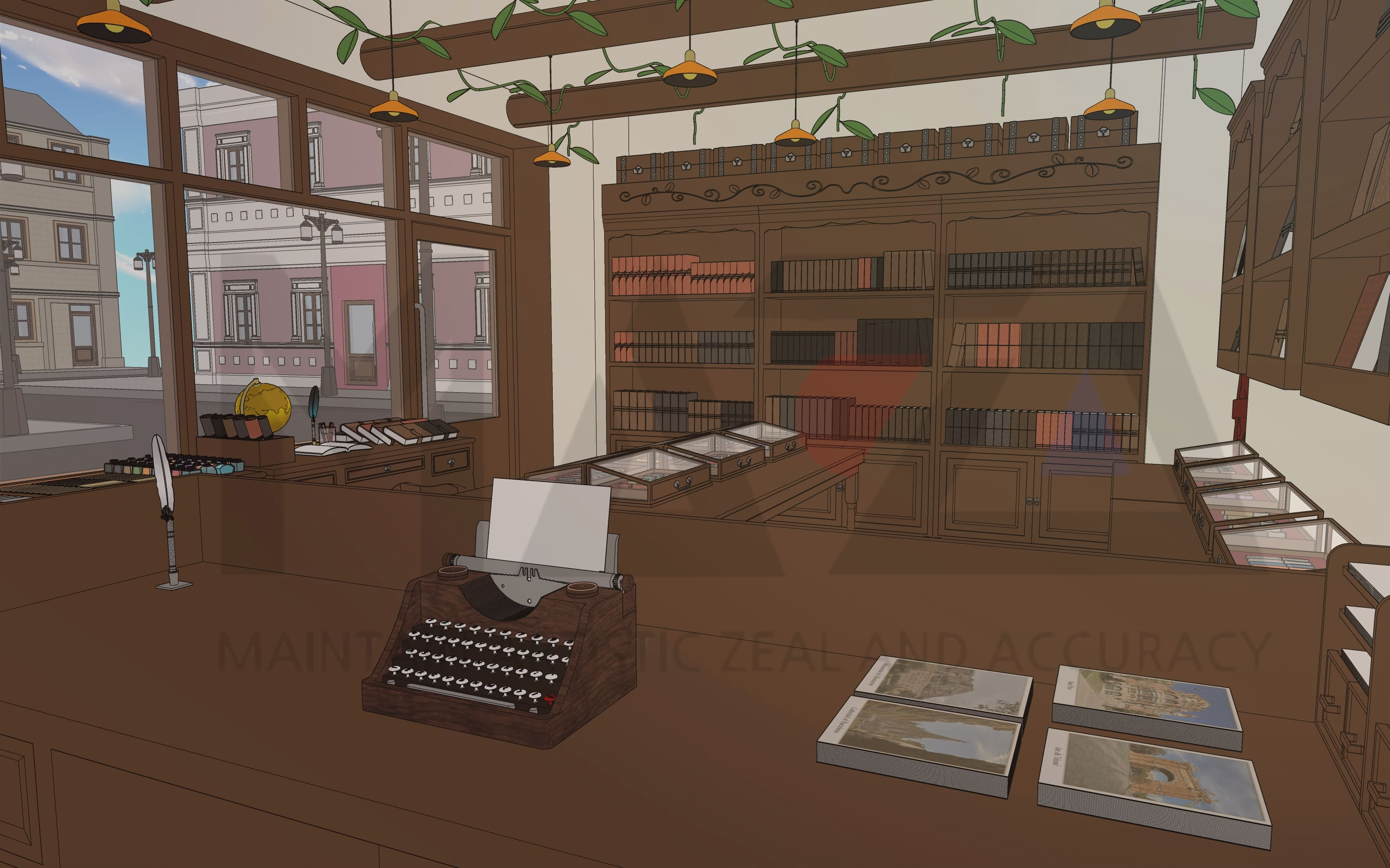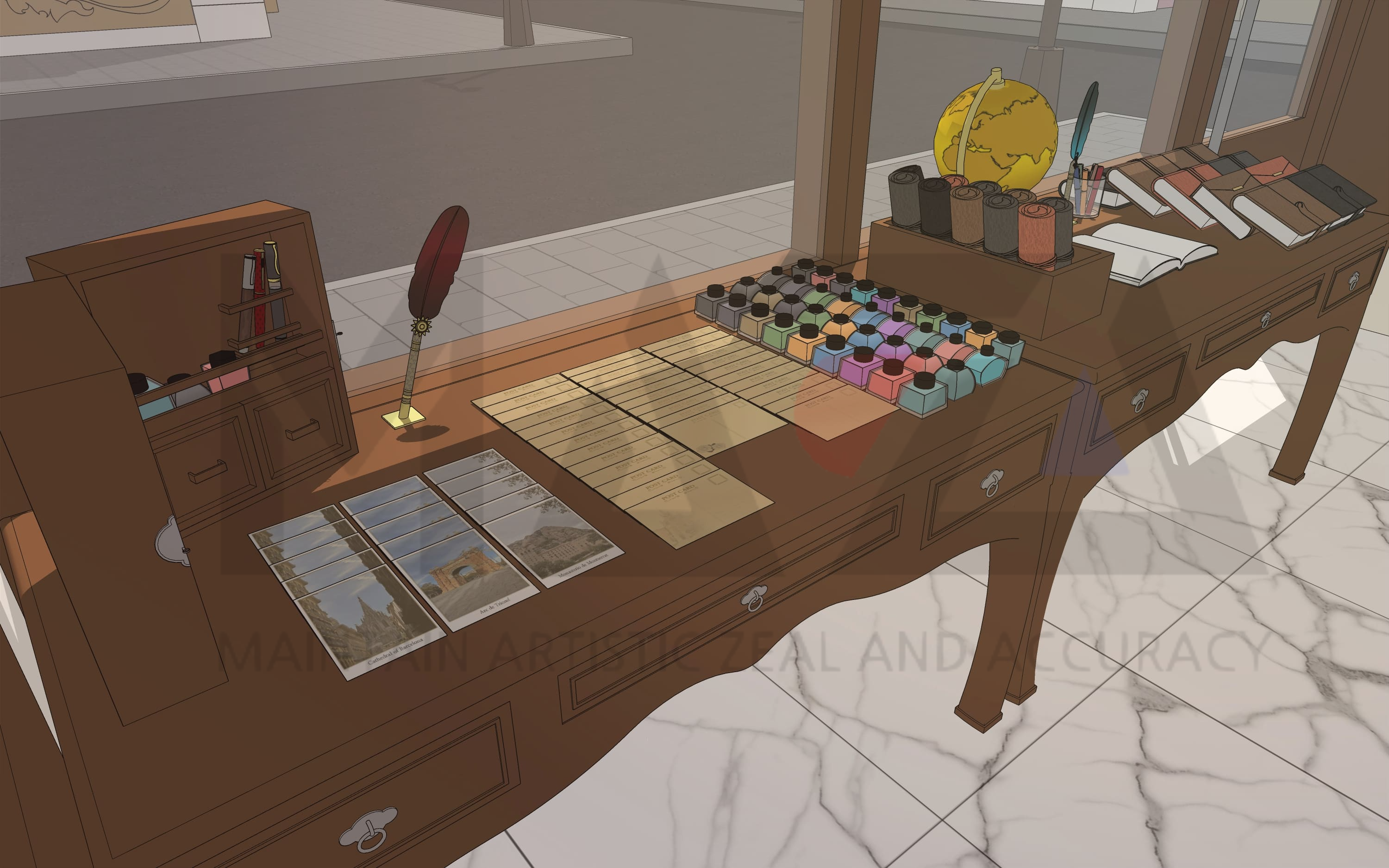 이번에 제작한 [유럽 거리에 있는 어느 만년필 잡화점] 웹툰 배경은 제가 바르셀로나를 여행하던 당시 봤던 건물들과 거리를 모티브로 삼아 제작한 잡화점 배경입니다. 잡화점 외부는 유럽 느낌이 날 수 있도록 유럽풍의 건물들과 공원으로 구성했고, 잡화점 내부의 경우 만년필과 노트를 판매하는 공간과 함께 만년필을 시필하거나 독서 모임을 하는 공간을 넣었습니다.