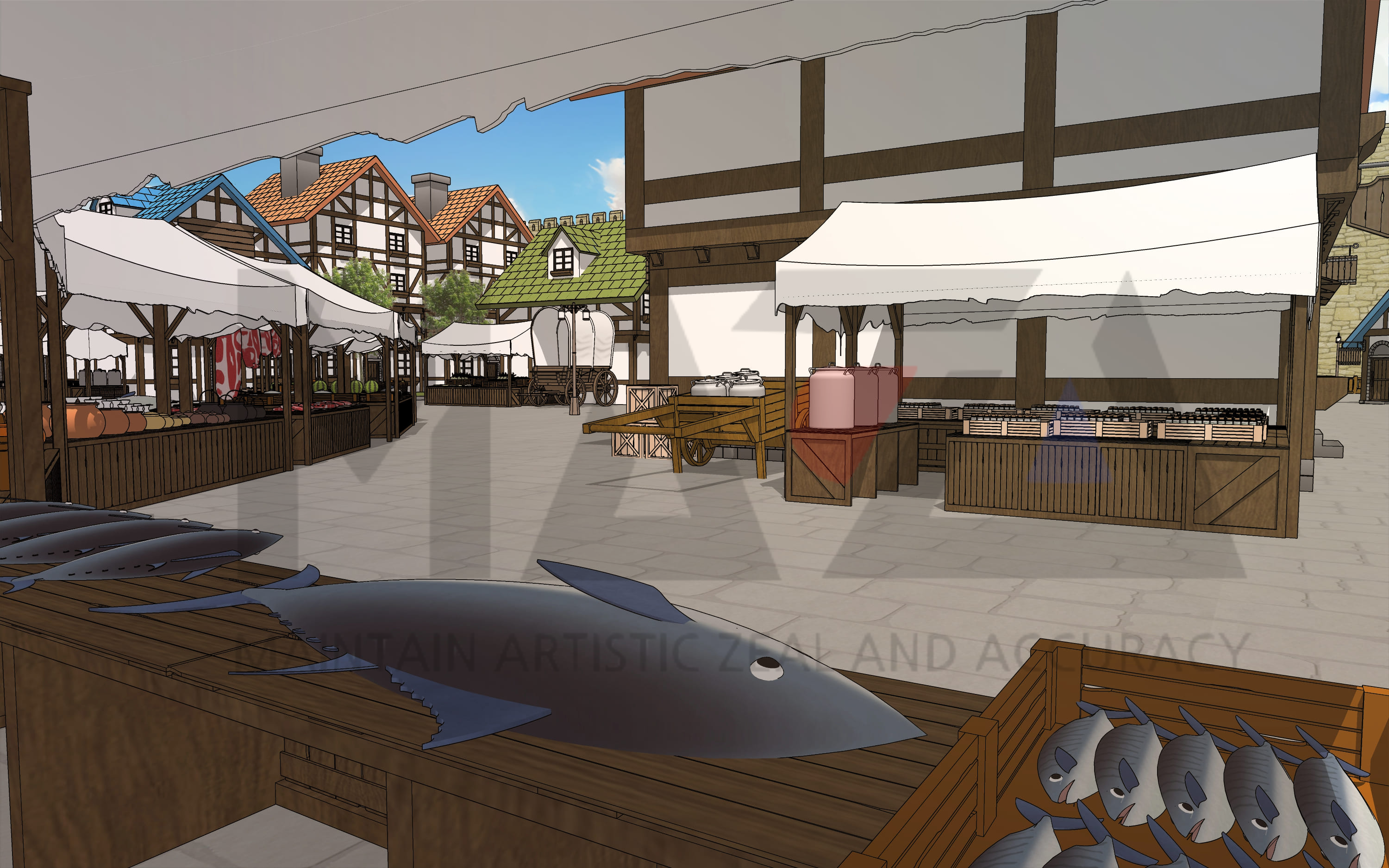 이번에 제작한 [중세 판타지 성 내부 마을] 배경은 얼마 전 소개해 드렸던 '로맨스 판타지 마법 학교(수도원) 세트' 배경과 연결되는 시리즈 배경입니다. 이번 웹툰 배경은 '마법 학교 아랫마을'이라는 컨셉으로 제작한 마을 배경이며 성안에 있는 작은 마을로 제작하였습니다. 참고로 마을 내부에는 수많은 상가와 집, 시장, 그리고 대장간들을 간단하게 조성해 놓았는데요. 시장 상점 구성의 경우 정육점, 과일 가게, 야채 가게, 빵 가게, 생선가게를 마을 내부에 배치를 해놨습니다. 비록 웹툰에서 찰나에 지나가는 장면에 불과하더라도 장면 하나하나가 알차게 보일 수 있도록 상점을 배치하였습니다. (마을입구에는 여행자들이 타고 온 말을 둘 수 있는 마사를 배치해 놓았습니다.)