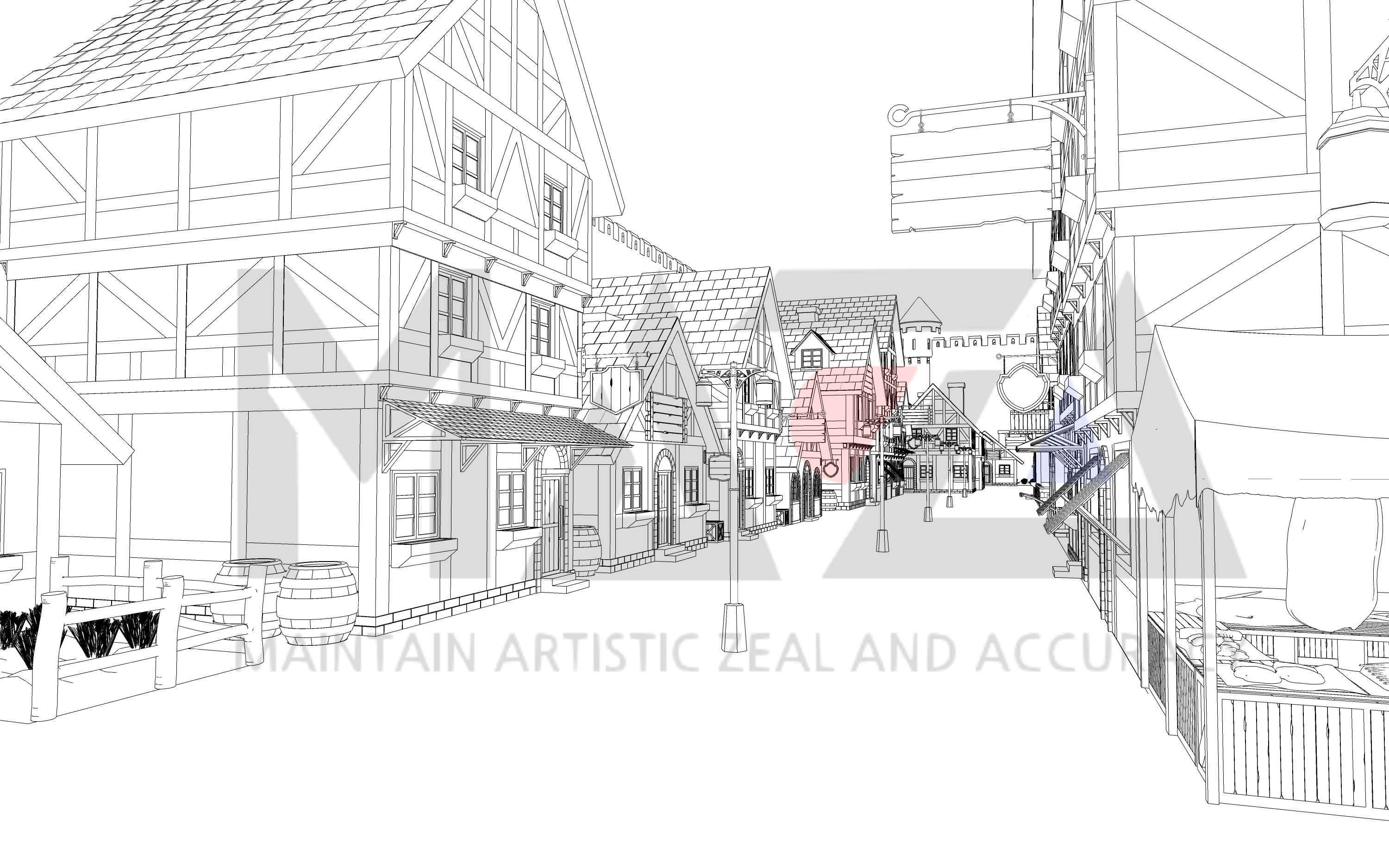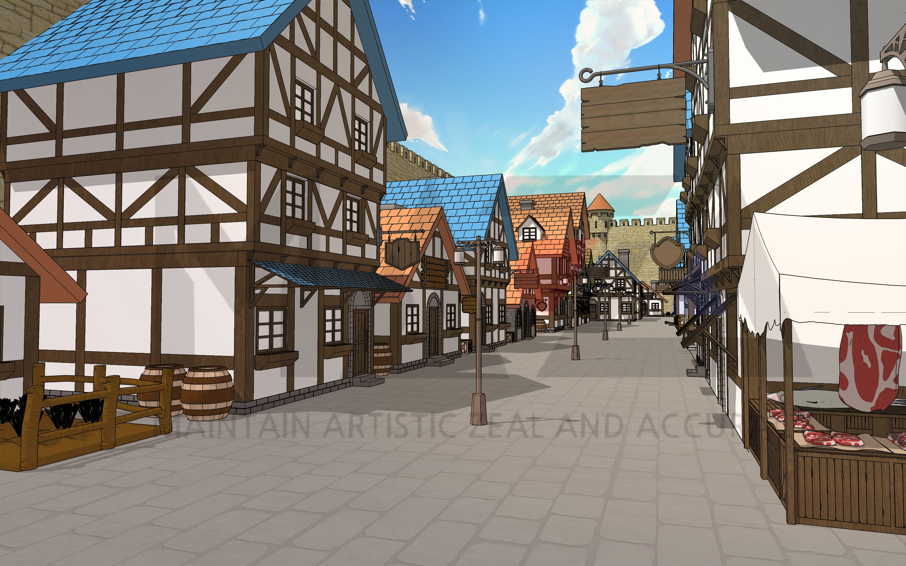 웹툰 배경 디자이너 마자(MAZA)입니다. 이번에 소개할 웹툰 배경은 중세 판타지 성 내부 마을입니다. 이번 웹툰 배경은 로맨스 판타지 장르물에서 연재 중이시거나 혹은 작품을 준비하고 계신 작가님들을 위해 준비해 본 가성비용 스케치업 배경인데요. 혹시나 현대물 장르에서도 과거 유적이 잘 보전되어 있는 해외의 중소도시 배경이 필요하신 분들도 계실까 싶어 제작하게 되었습니다.