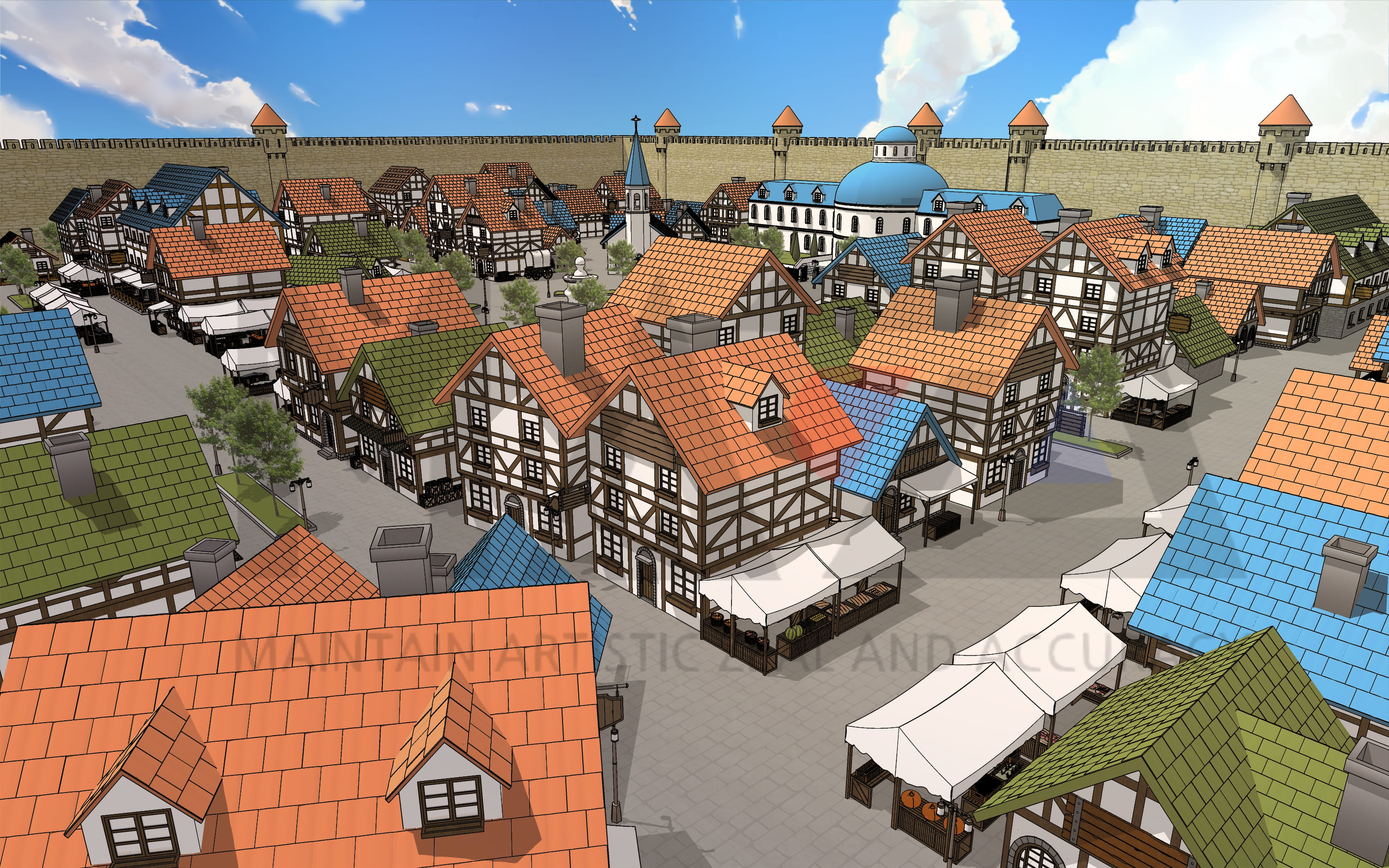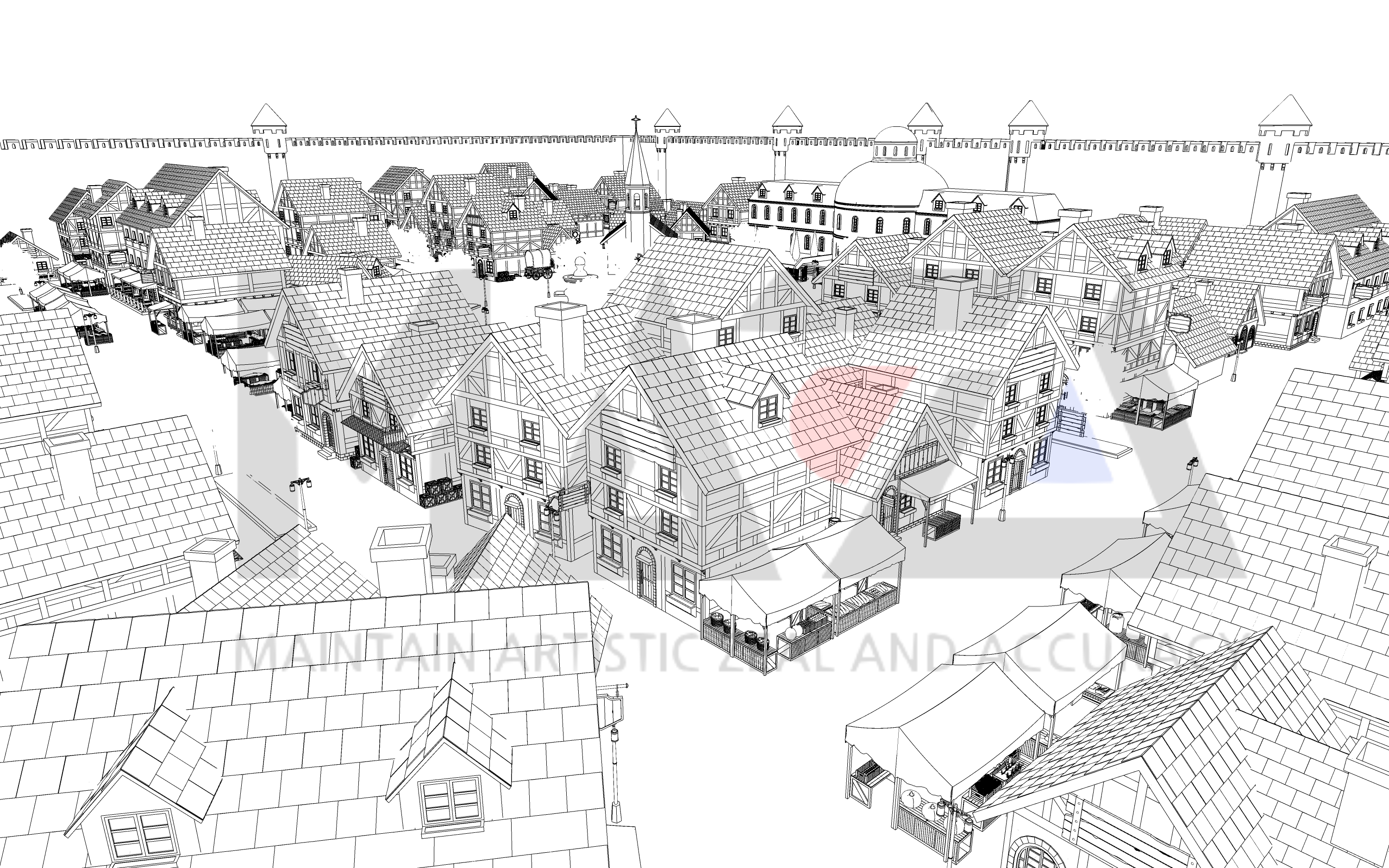 웹툰 배경 디자이너 마자(MAZA)입니다. 이번에 소개할 웹툰 배경은 중세 판타지 성 내부 마을입니다. 이번 웹툰 배경은 로맨스 판타지 장르물에서 연재 중이시거나 혹은 작품을 준비하고 계신 작가님들을 위해 준비해 본 가성비용 스케치업 배경인데요. 혹시나 현대물 장르에서도 과거 유적이 잘 보전되어 있는 해외의 중소도시 배경이 필요하신 분들도 계실까 싶어 제작하게 되었습니다.