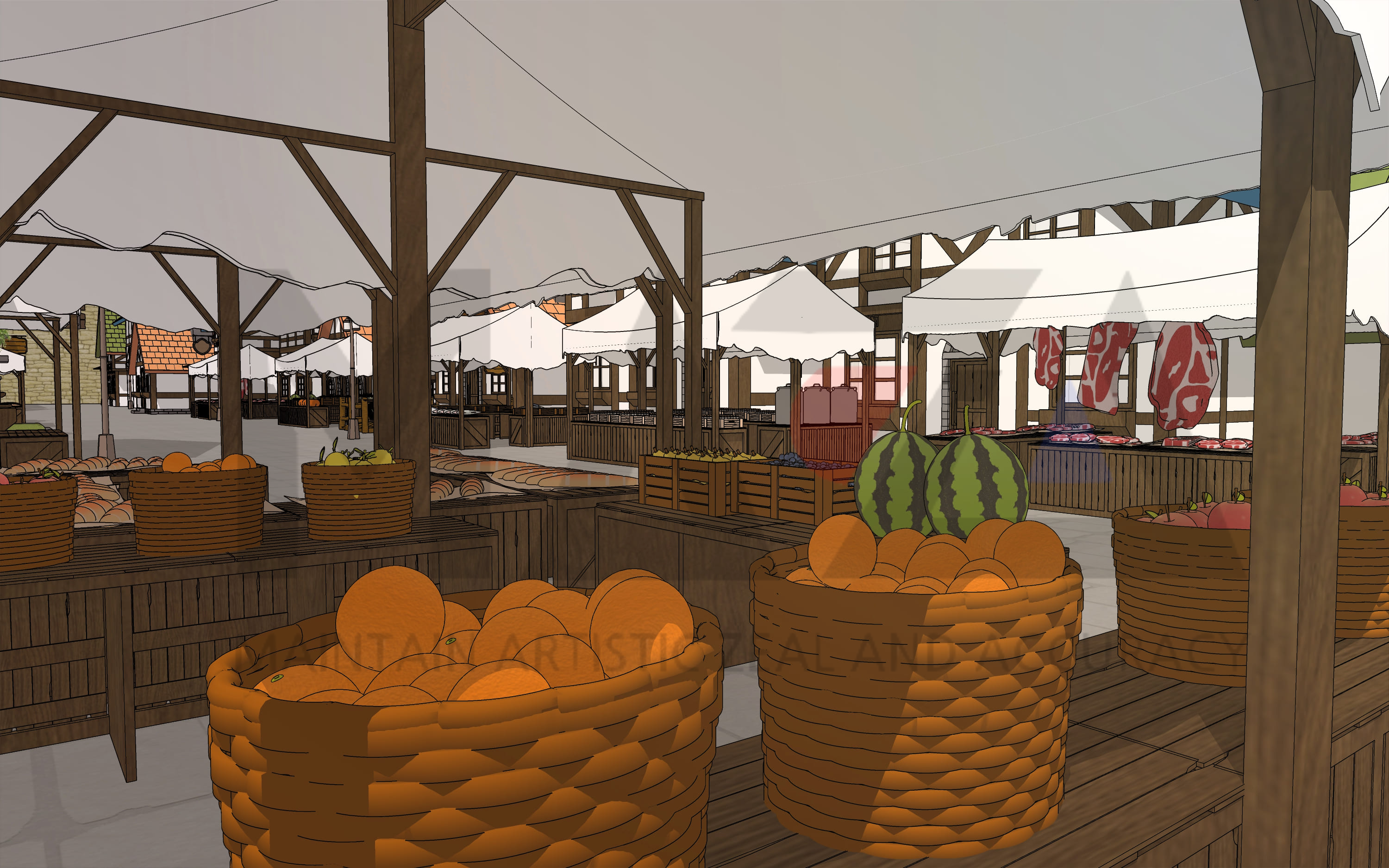 이번에 제작한 [중세 판타지 성 내부 마을] 배경은 얼마 전 소개해 드렸던 '로맨스 판타지 마법 학교(수도원) 세트' 배경과 연결되는 시리즈 배경입니다. 이번 웹툰 배경은 '마법 학교 아랫마을'이라는 컨셉으로 제작한 마을 배경이며 성안에 있는 작은 마을로 제작하였습니다. 참고로 마을 내부에는 수많은 상가와 집, 시장, 그리고 대장간들을 간단하게 조성해 놓았는데요. 시장 상점 구성의 경우 정육점, 과일 가게, 야채 가게, 빵 가게, 생선가게를 마을 내부에 배치를 해놨습니다. 비록 웹툰에서 찰나에 지나가는 장면에 불과하더라도 장면 하나하나가 알차게 보일 수 있도록 상점을 배치하였습니다. (마을입구에는 여행자들이 타고 온 말을 둘 수 있는 마사를 배치해 놓았습니다.)