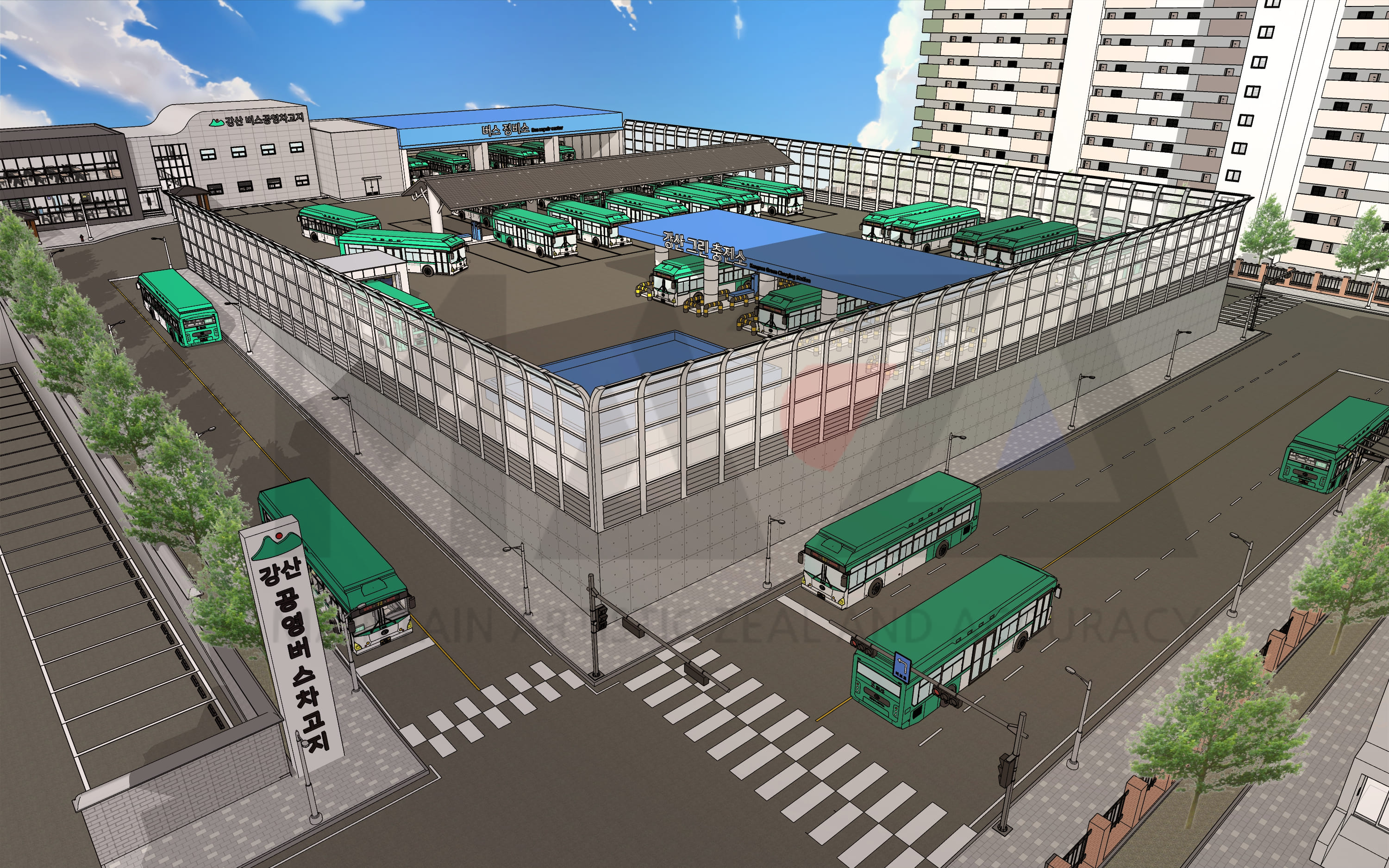 [웹툰 배경] 수소전기버스 종점(공영차고지). 현대물 장면 속 현실감을 더해주는 대중교통 배경.