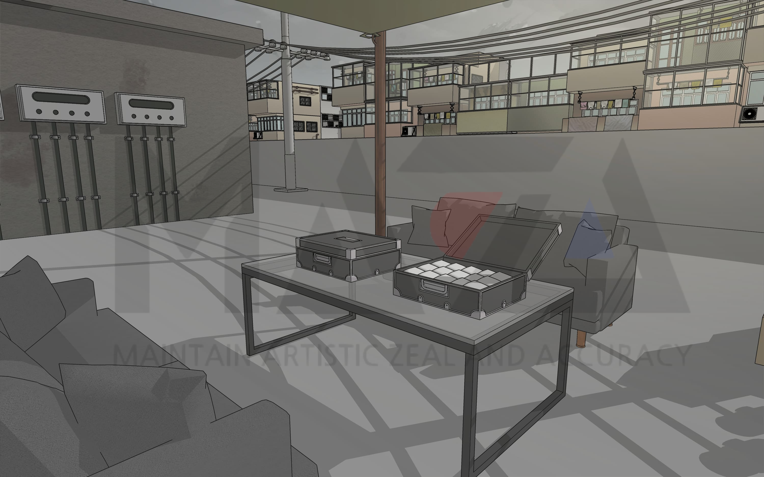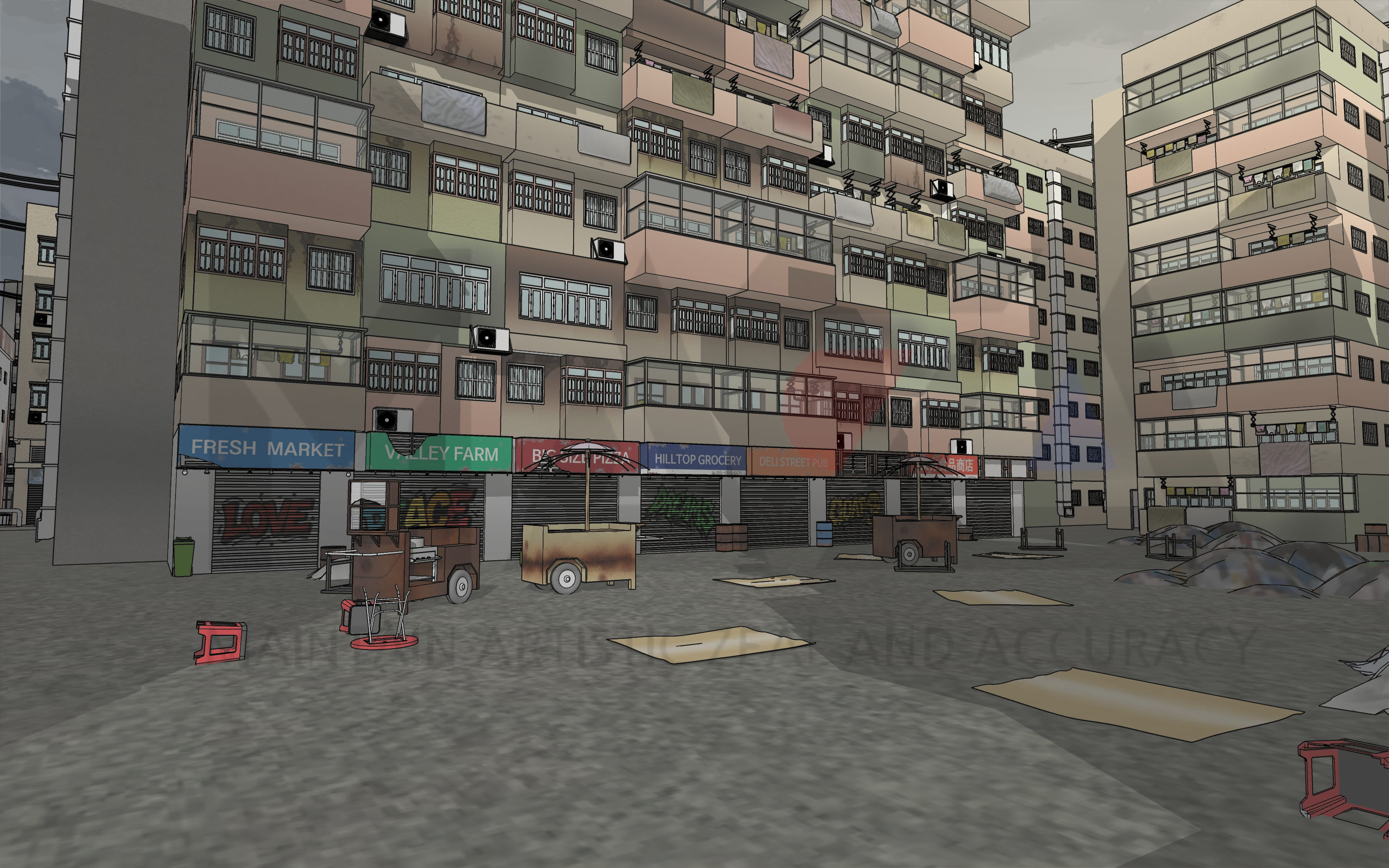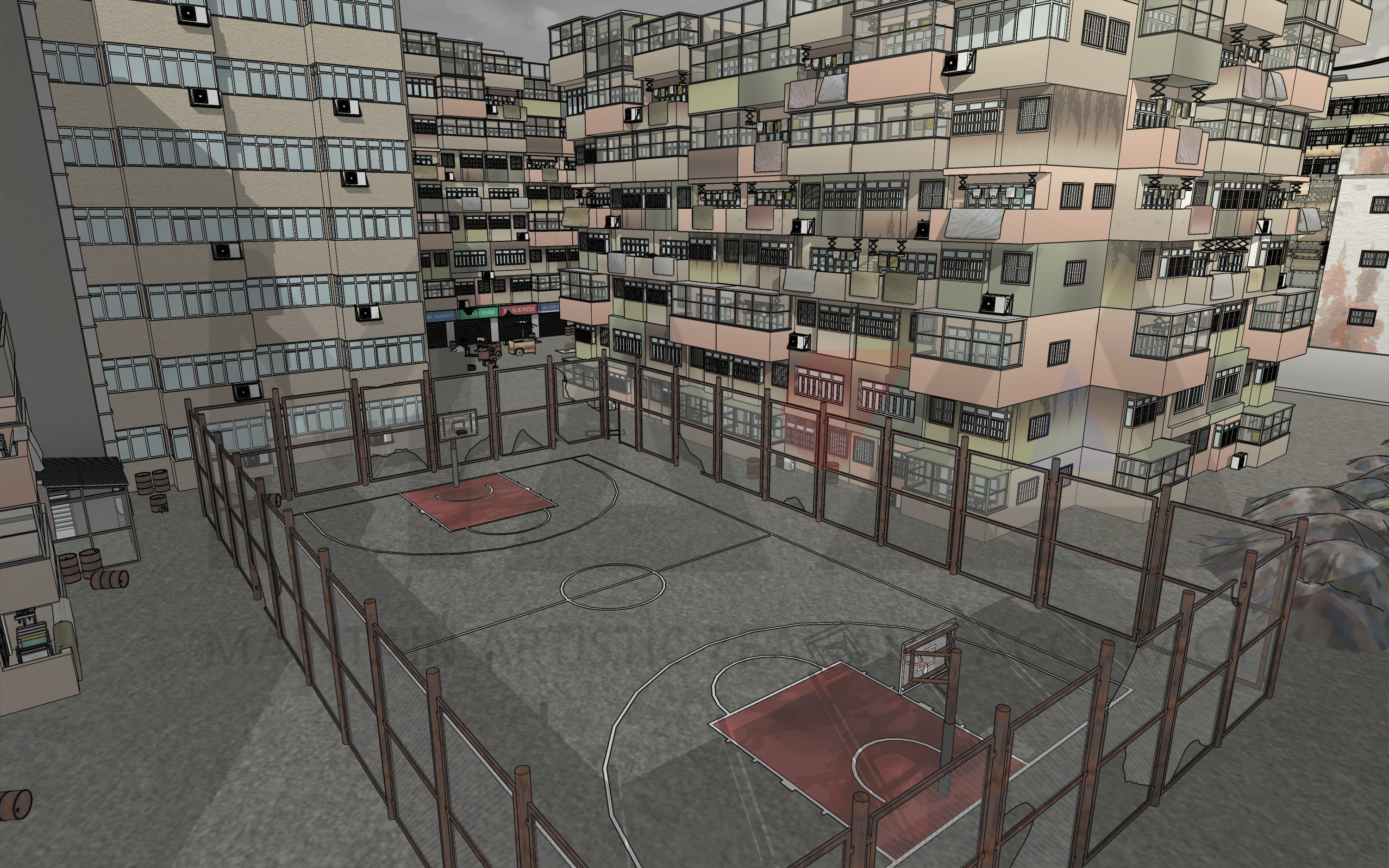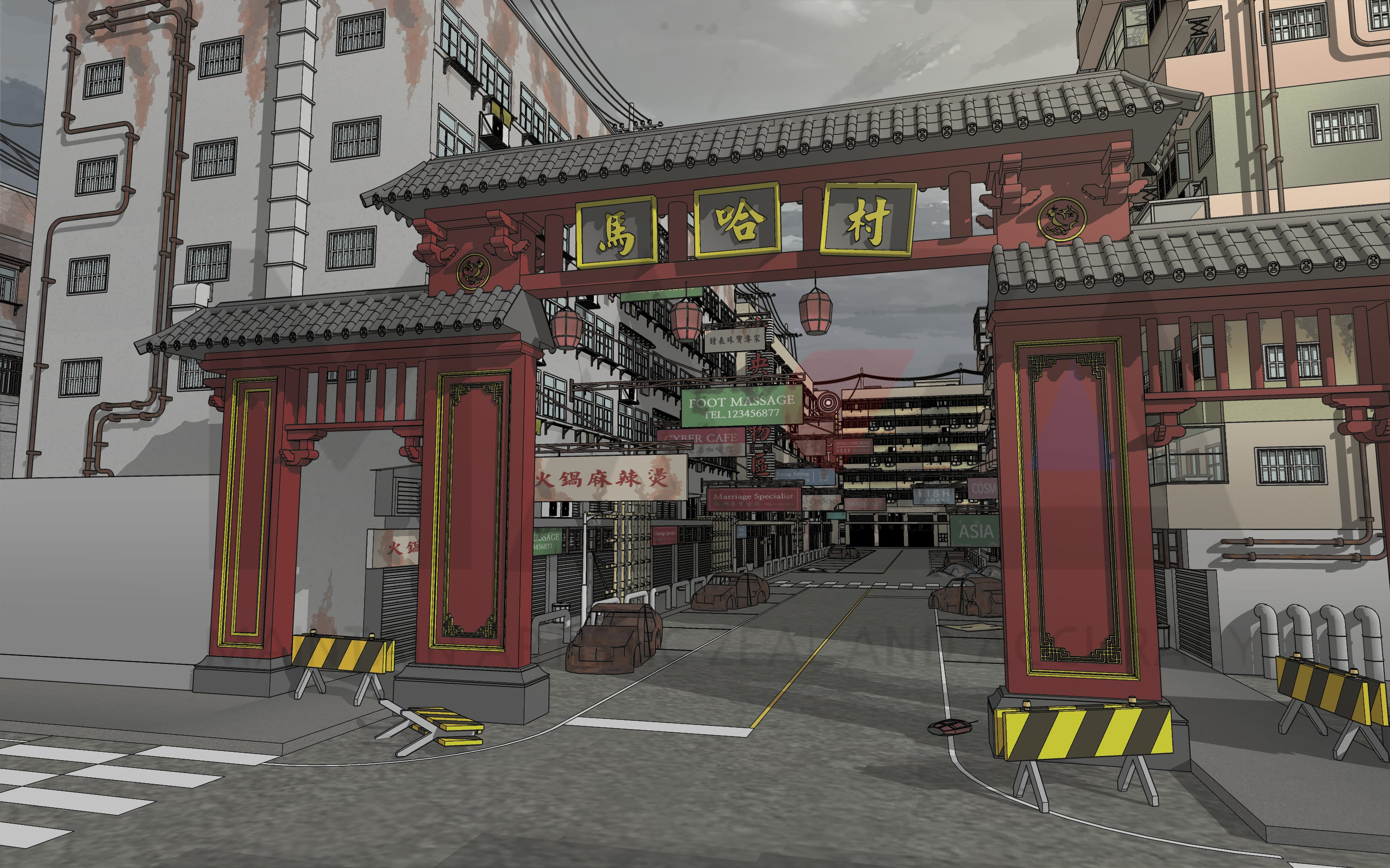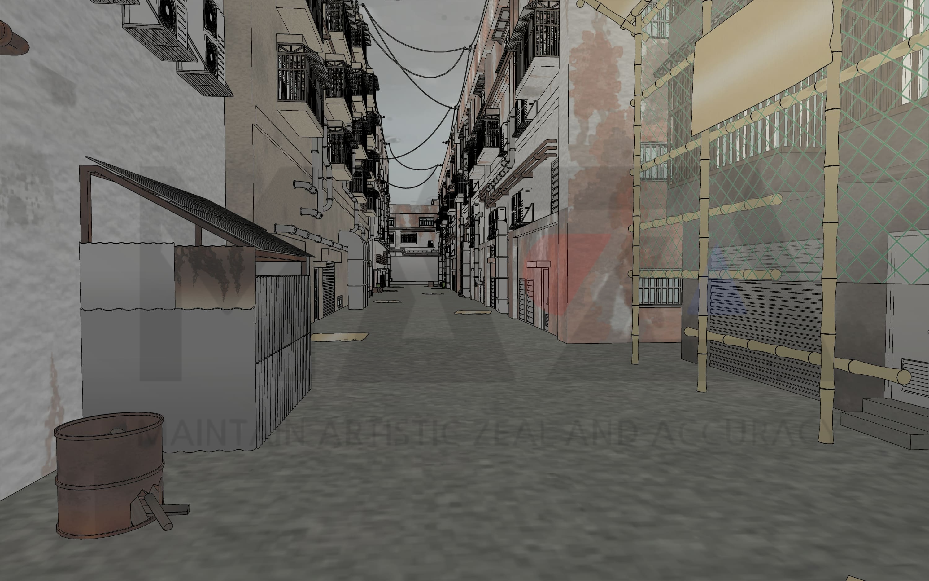처음에는 빈민가에서 나고 자란 아시아계 운동선수의 고향을 상상하며 이 배경을 제작하게 되었습니다. 슬럼화된 빈민촌 배경을 제작하다 보니 문득 느와르물에도 다양하게 사용할 수 있으면 좋겠다는 생각에 도시 규모를 약간 더 키워 거의 유령마을이 되다시피한 빈민촌을 제작하게 되었지요. (폐허가 된 빈민가 느낌을 더 살릴 수 있도록 중국풍, 홍콩풍 느낌의 도시 배경을 제작해 봤습니다.)