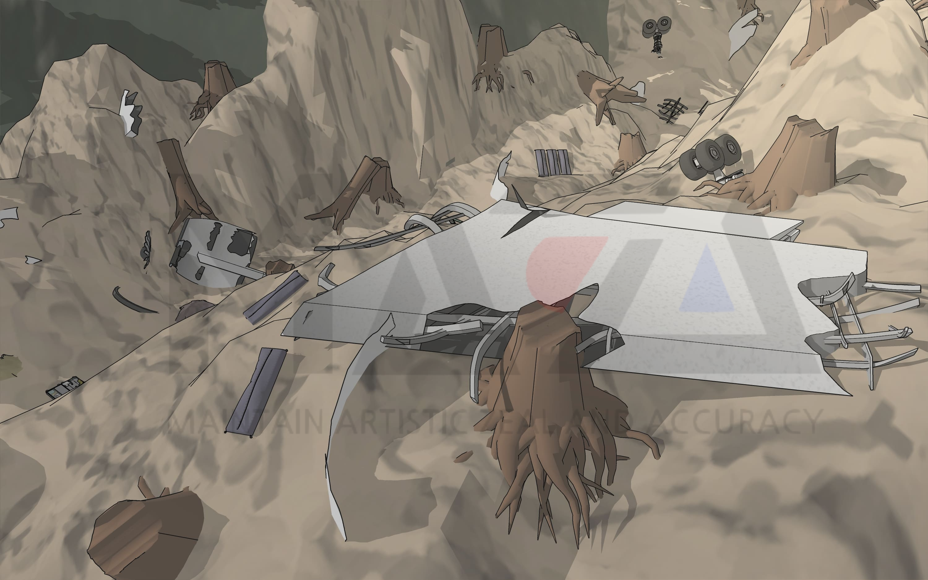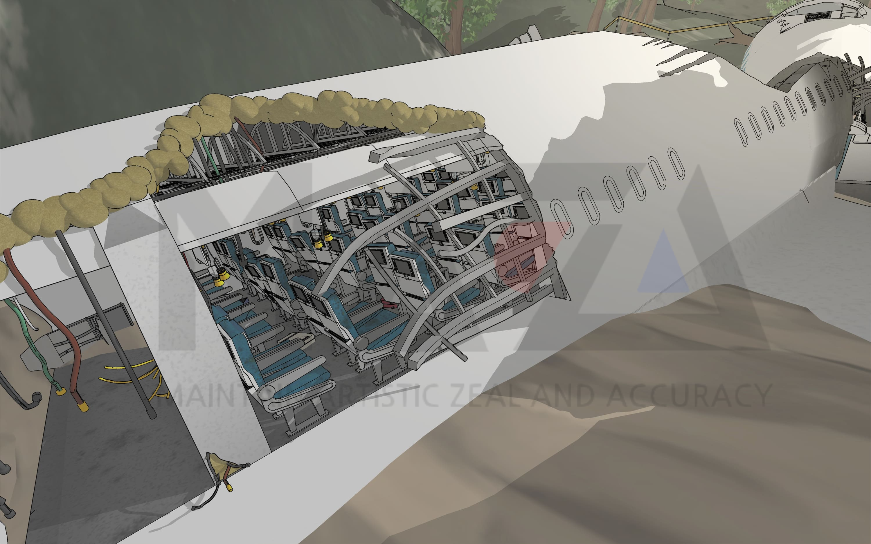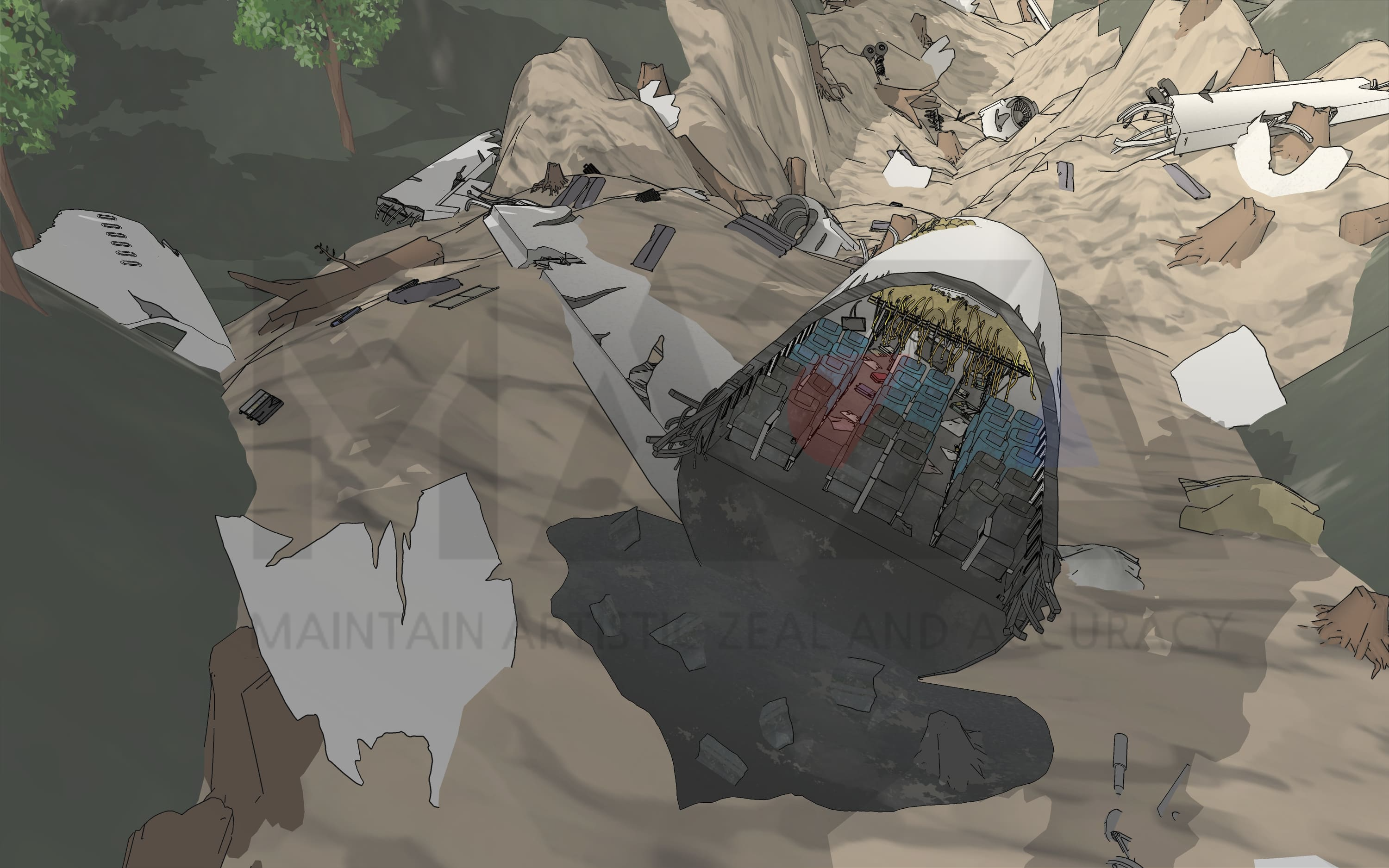 이번에 제작한 '비행기 추락사고 재난 현장' 웹툰 배경은 비행기 사고 현장을 상상하며 제작해 봤습니다. 실제 비행기 추락 사고 현장처럼 흔적이 거의 없도록 만들까도 생각하였으나 웹툰 작가님들께서 다양한 상황에서 연출을 하실 수 있도록 비행기 동체가 일부 남아있는 재난 현장을 만들었지요. 비행기가 추락하게 된 원인이 단순한 기계 결함인지 아니면 어떤 외계 생명체에 의해 추락한 건지 구분할 수 없도록 비행기 사고 현장 배경을 제작하였습니다.