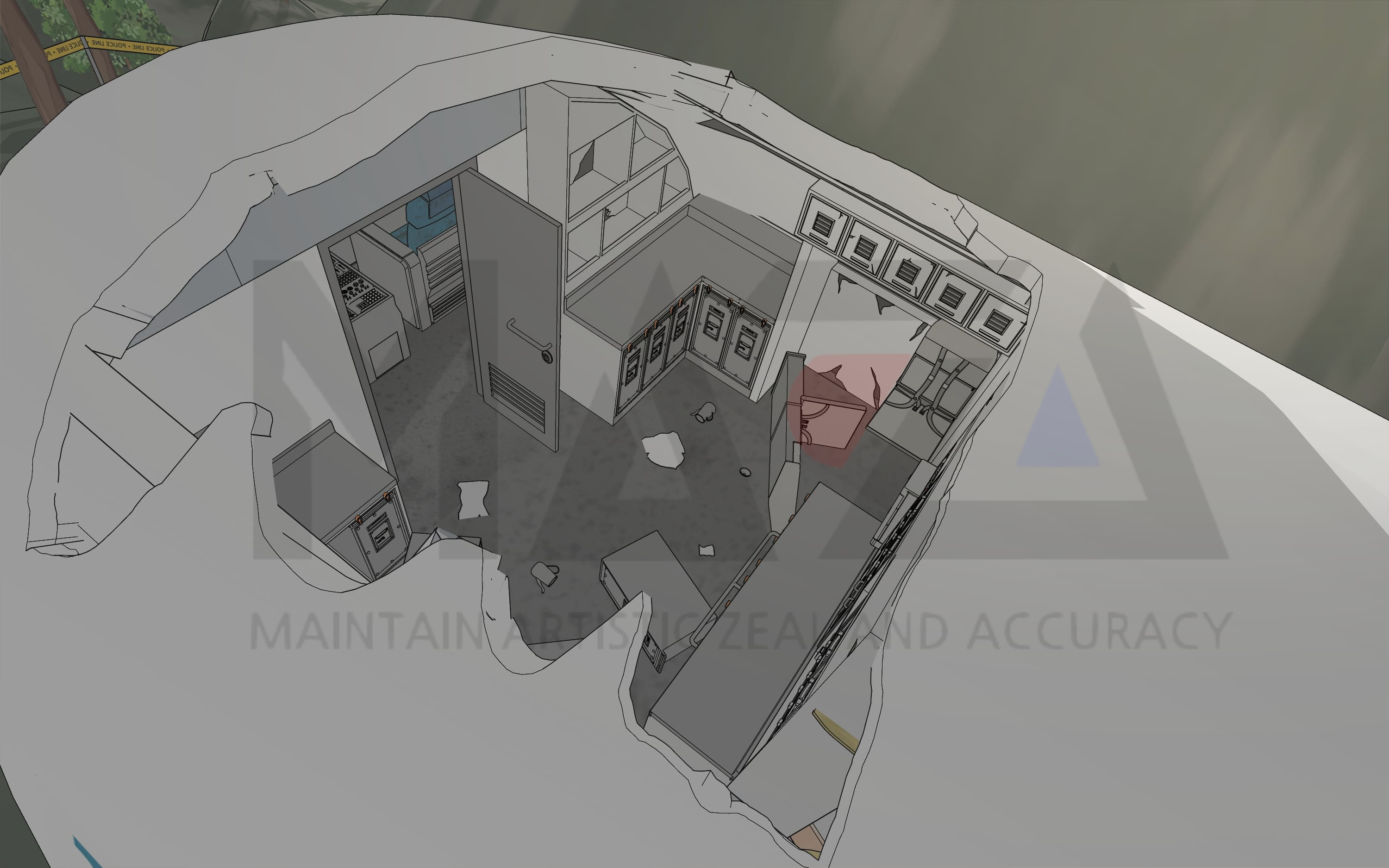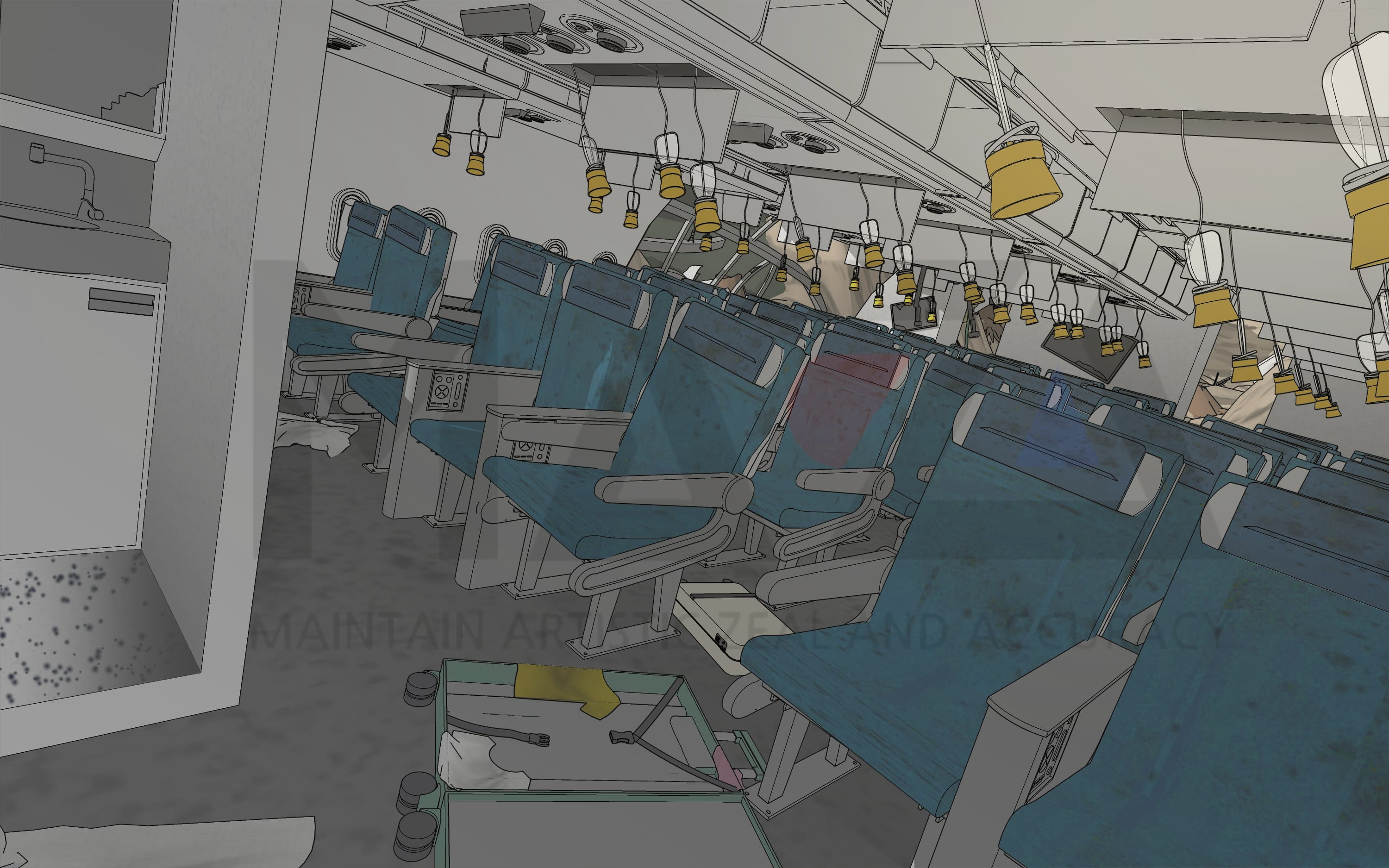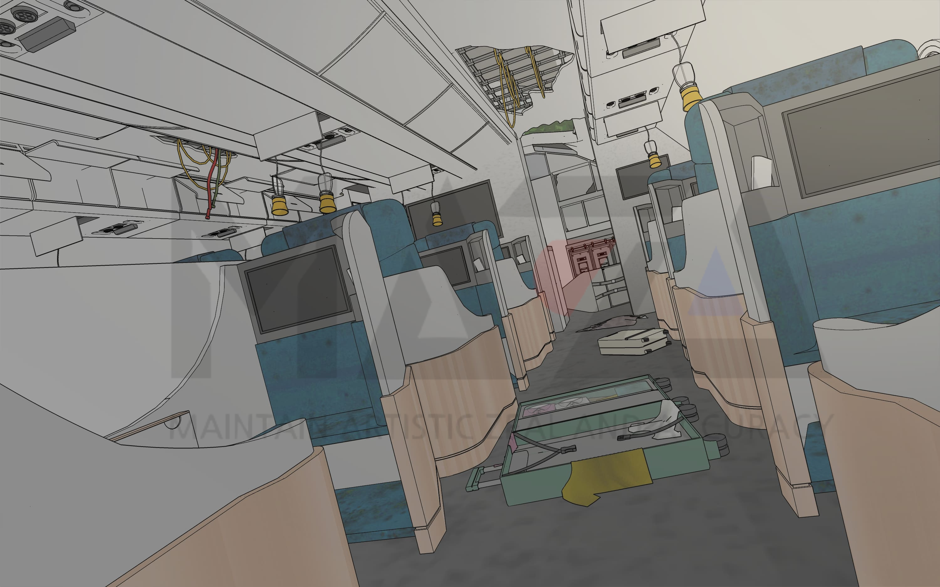 이번에 제작한 '비행기 추락사고 재난 현장' 웹툰 배경은 비행기 사고 현장을 상상하며 제작해 봤습니다. 실제 비행기 추락 사고 현장처럼 흔적이 거의 없도록 만들까도 생각하였으나 웹툰 작가님들께서 다양한 상황에서 연출을 하실 수 있도록 비행기 동체가 일부 남아있는 재난 현장을 만들었지요. 비행기가 추락하게 된 원인이 단순한 기계 결함인지 아니면 어떤 외계 생명체에 의해 추락한 건지 구분할 수 없도록 비행기 사고 현장 배경을 제작하였습니다.