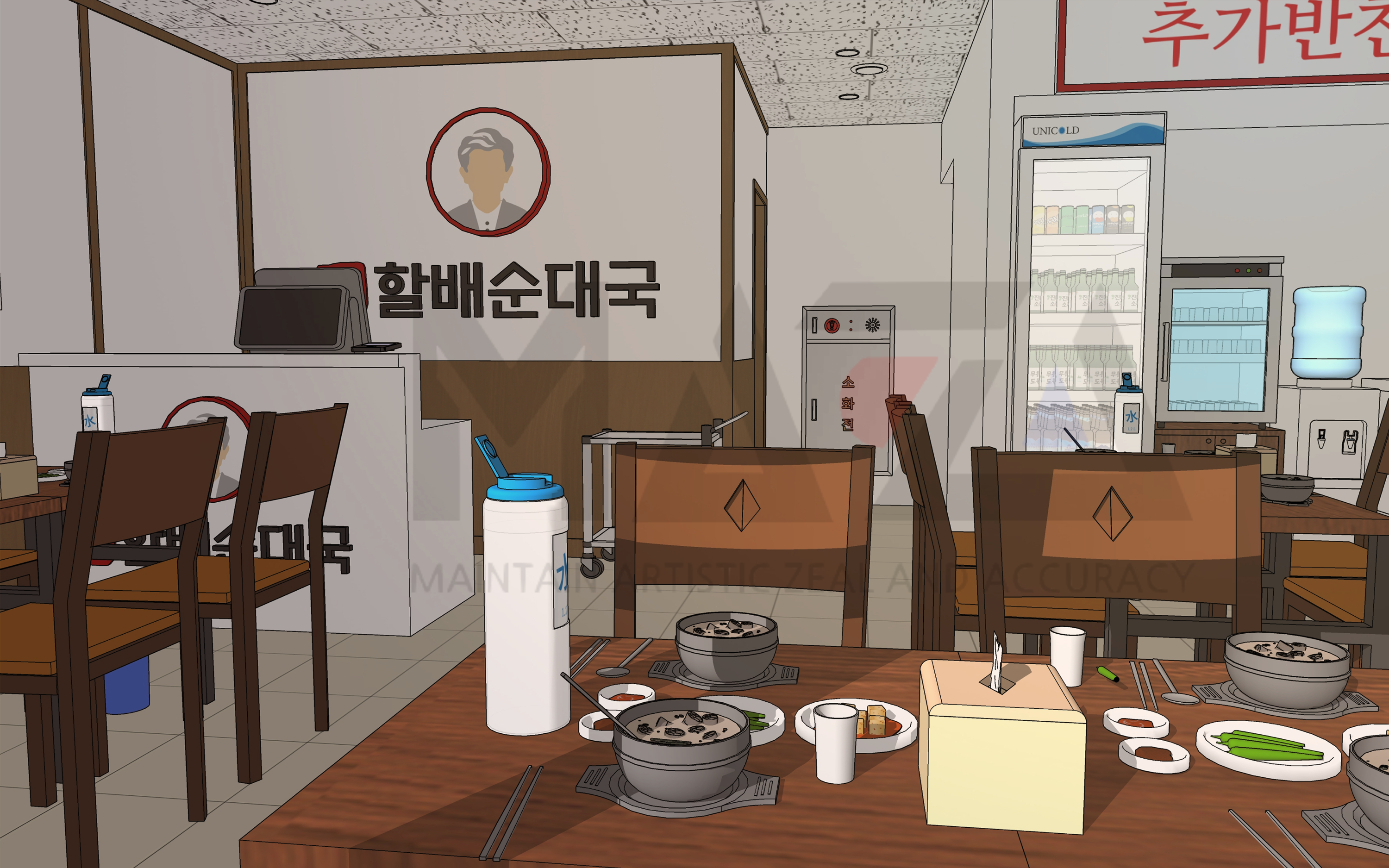 웹툰배경 디자이너 마자(MAZA)입니다. 이번에 소개할 웹툰배경은 [24시 순대국집] 입니다. 순대국집은 우리 주변에서는 너무나도 흔히 볼 수 있는 음식점인데요. 일상물이나 현대물 장르에서 연재중이신 작가님들이나 혹은 작품을 준비하고 계신 작가님들께서 국밥집과 관련된 배경이 필요하지 않으실까 싶어 제작하게 되었습니다.
