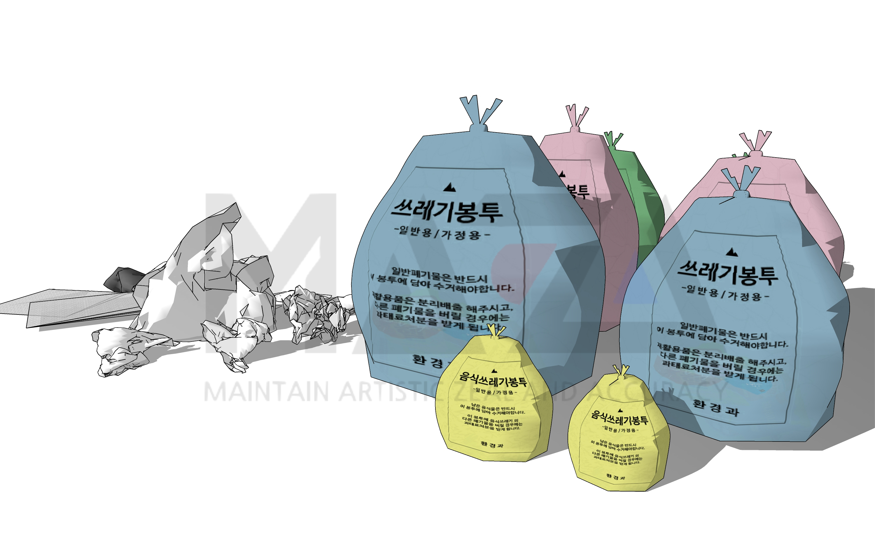 종량제봉투 쓰레기와 음식쓰레기봉투, 구겨진 종이, 소형 비닐봉지, 그리고 뾱뾱이를 만들어 넣었습니다.