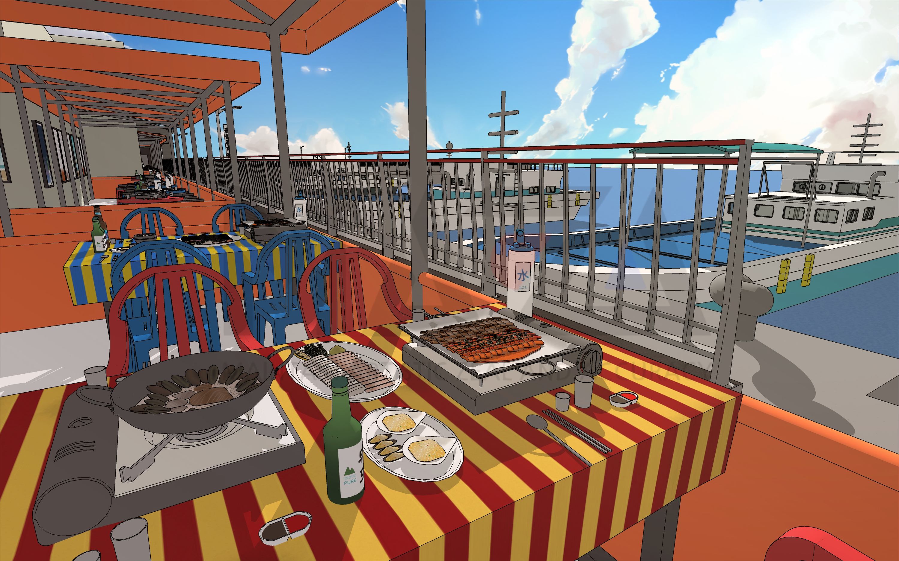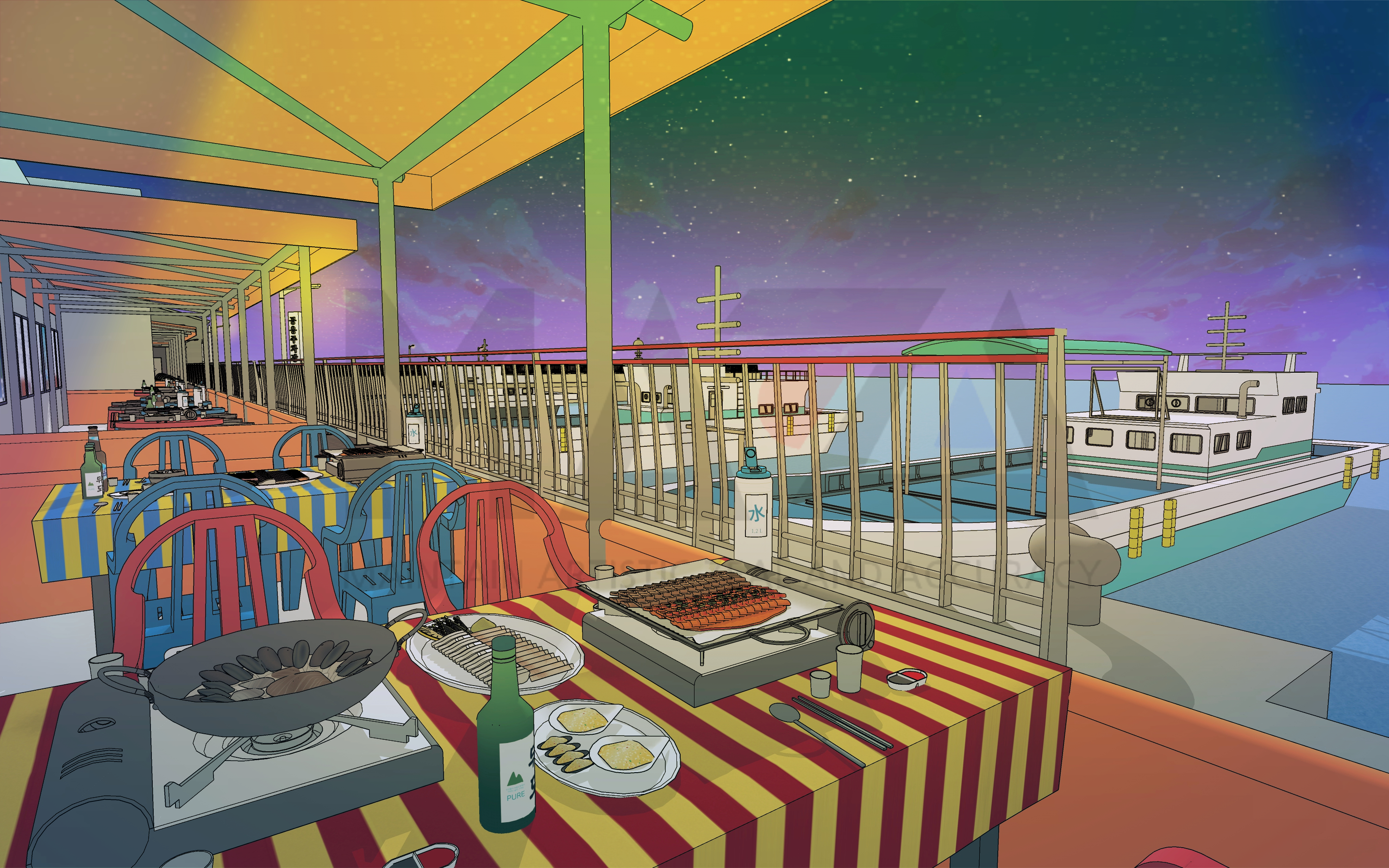 [웹툰 배경] 방파제 포장마차 거리. 낭만적인 바다 여행 연출에 좋은 배경.