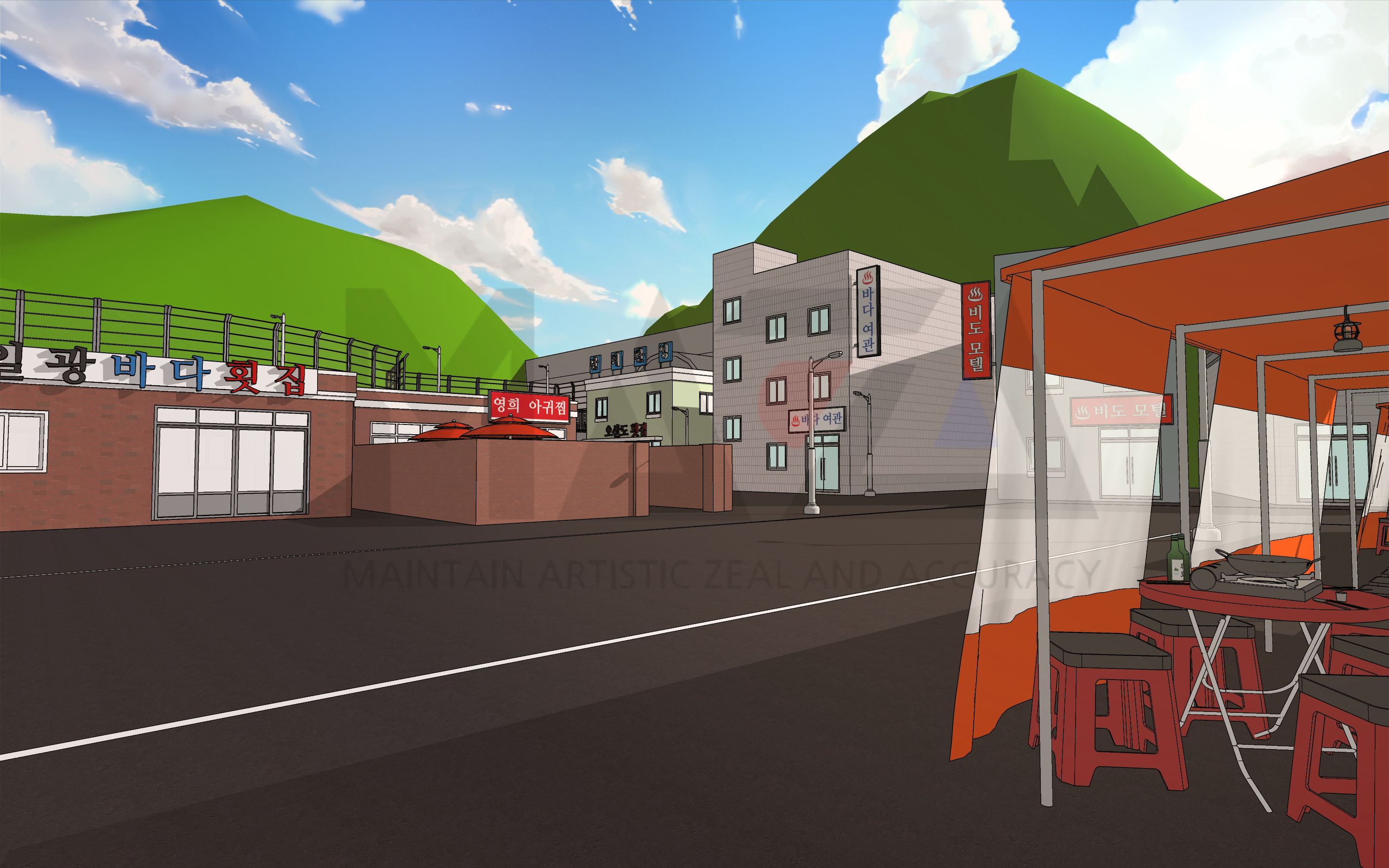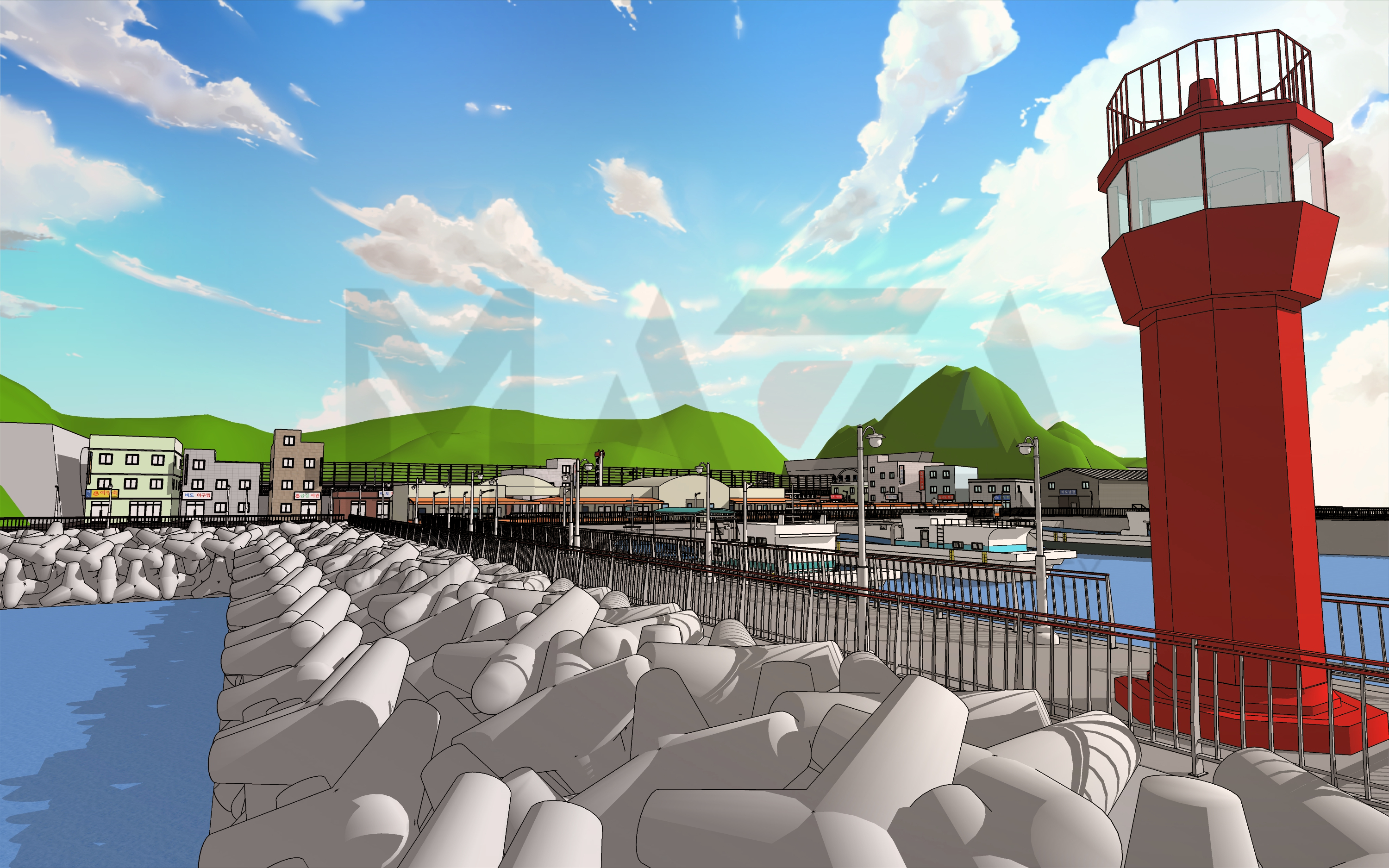 이번에 제작한 [방파제 포장마차 거리] 배경은 시골 해변가에 있는 방파제를 모티브로 삼아 만든 포장마차 거리 웹툰 배경입니다. (*내부 배경에 적힌 '비도 방파제'는 제가 임시로 지은 명칭입니다.)